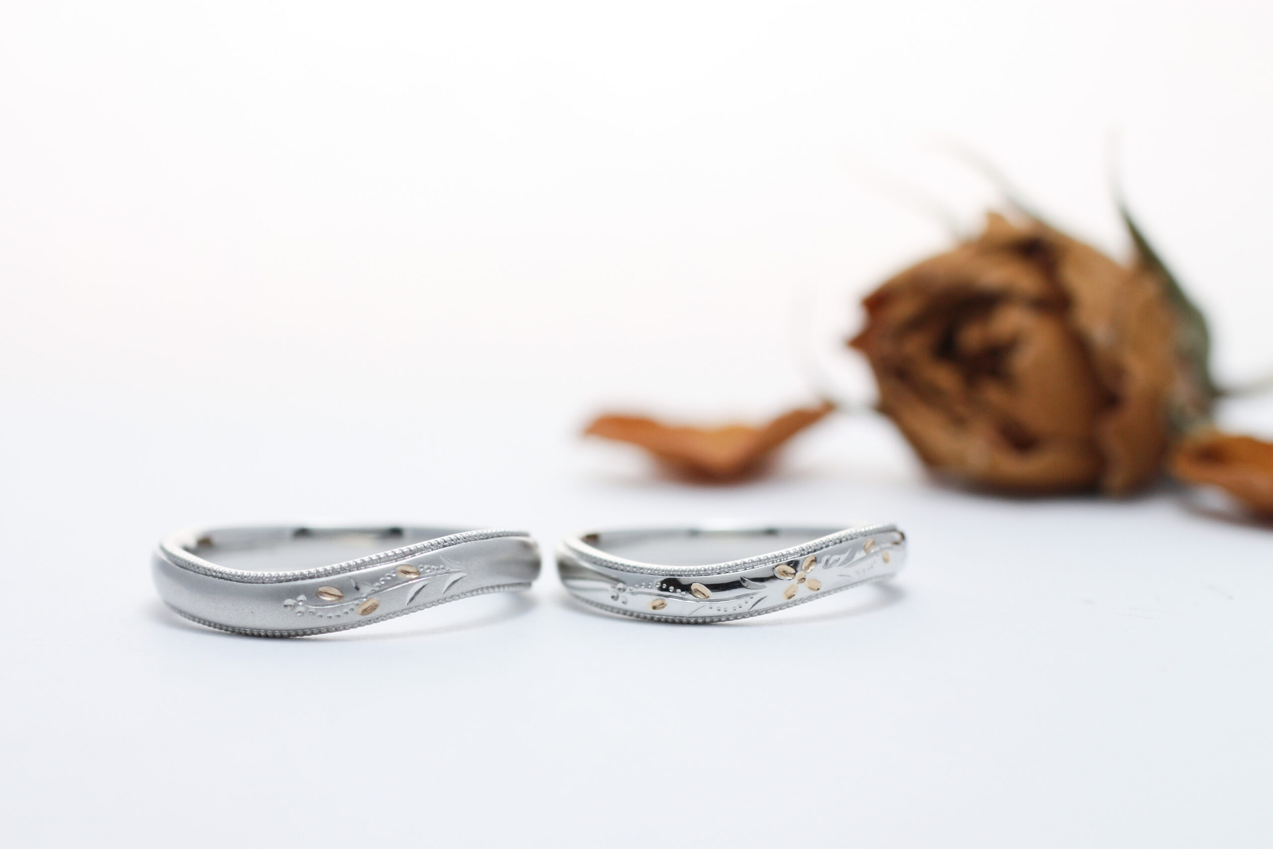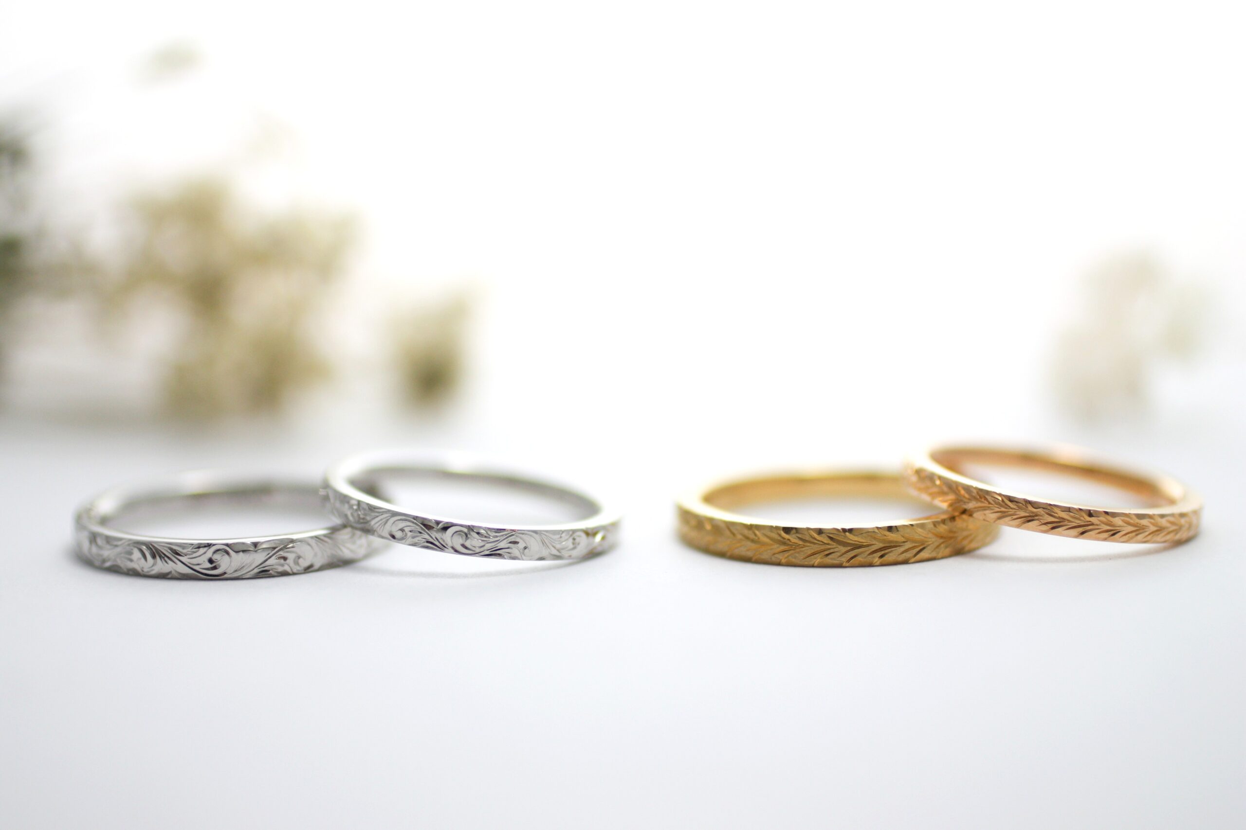 彫模様が施された結婚指輪。