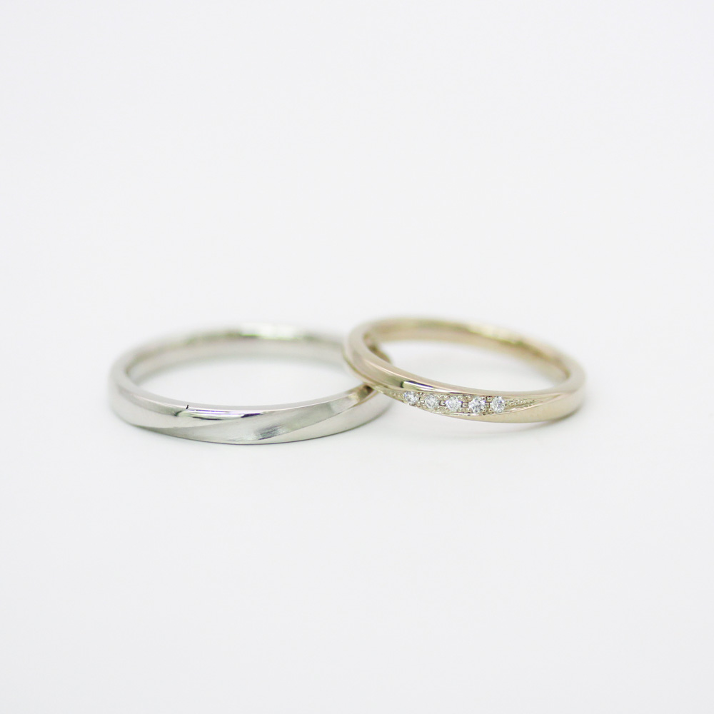 婚約指輪に合うカーブラインやさりげなくブラウンゴールドを入れて、自分たちらしさをだす事の出来るセミオーダーで注文させていただきました。