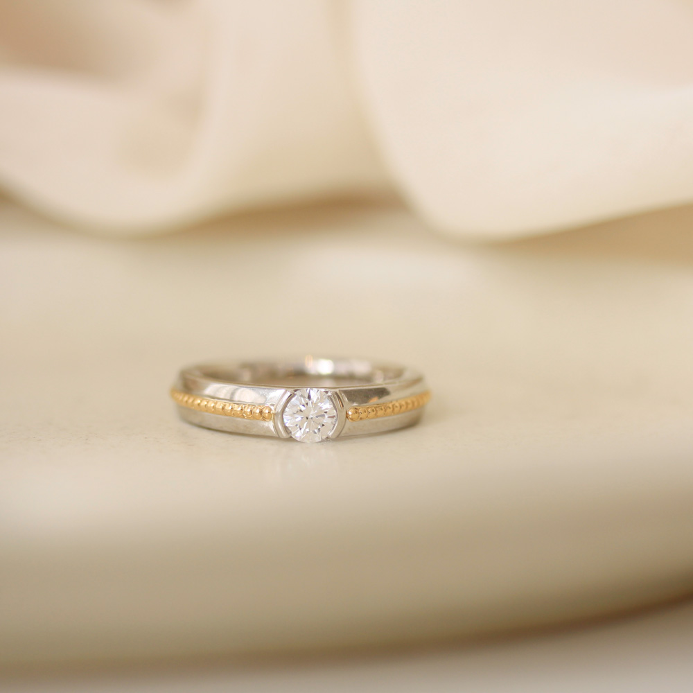 長年大切に身につけてこられた結婚指輪には、1石のダイヤモンドが輝いており、そこに今回新たに使われていなかったお持ちのリングのダイヤモンドを追加することで、より華やかなデザインへと生まれ変わりました。